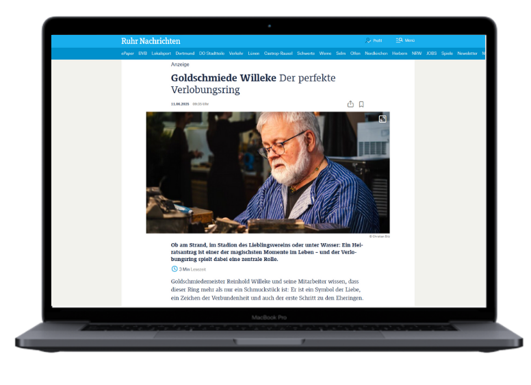 Mehrere redaktionell aufbereitete Online-Artikel unter ruhrnachrichten.de beleuchten die Besonderheiten seiner Arbeit – von der Werkstatt über moderne Fertigungstechniken bis hin zu Angeboten für Paare, die ihre Trauringe selbst gestalten möchten.