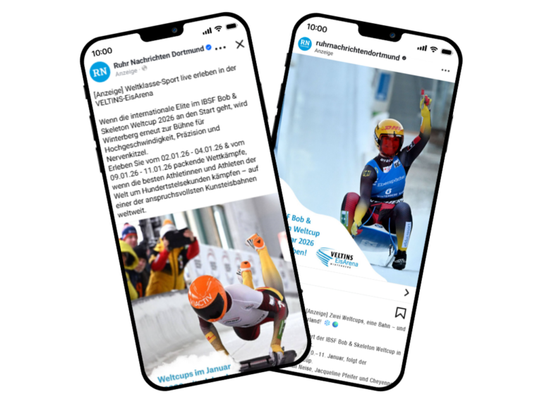 Fünf Social-Media-Posts auf den Kanälen von RUHR24 und den Ruhr Nachrichten begleiteten die Kampagne, vom Tag der offenen Tür über die Weltcup-Highlights bis hin zu Angeboten rund um den Freizeitsport, und erzielten zusätzliche Reichweite sowie wertvolle Interaktionen in sportaffinen Zielgruppen.